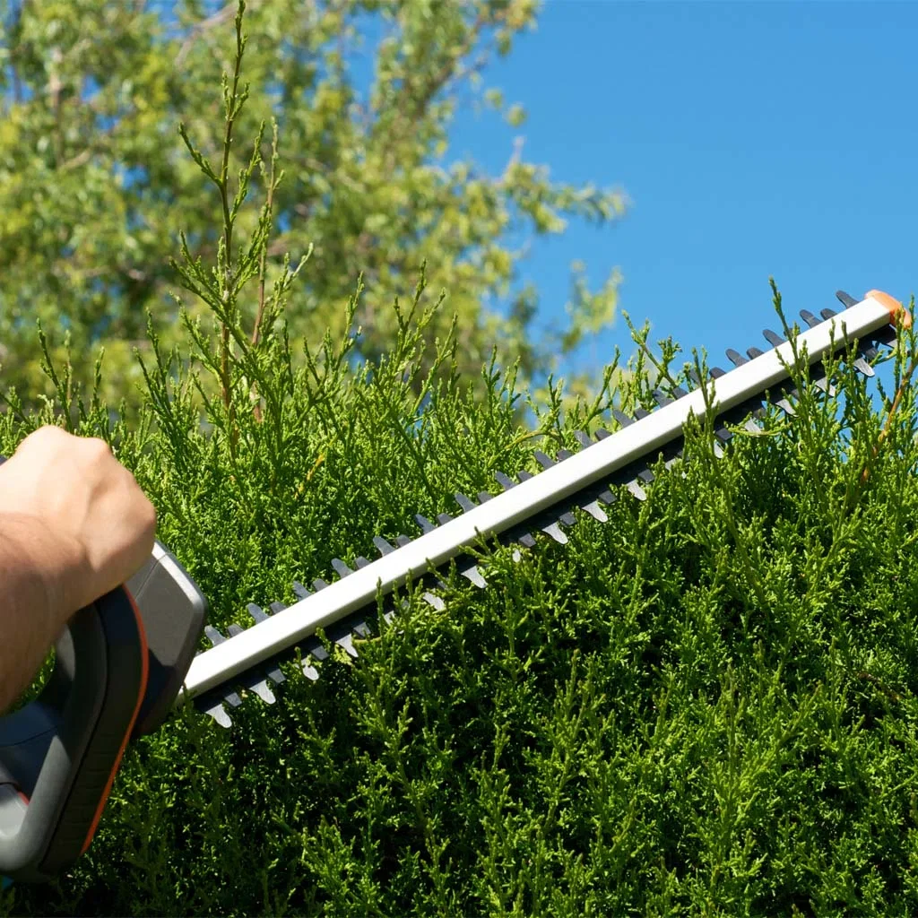 Beskjæring av hekk med elektrisk hekksaks gir en jevn og tett form.