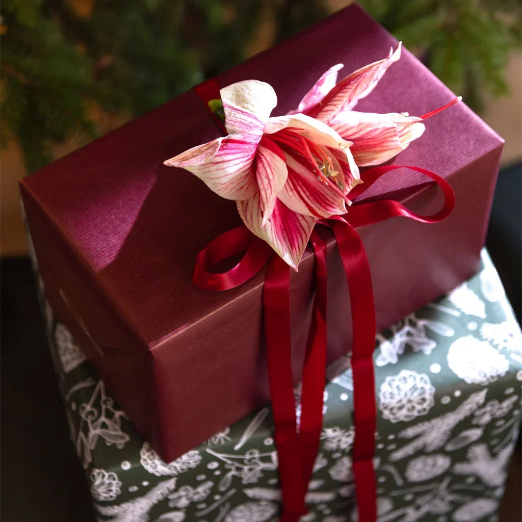 Under det elegante juletreet finner du julegaver som skimrer i gull med vakre satengbånd, og pakker i burgunder og skogsgrønt. Her finner du gaveinnpakning til en elegant jul.