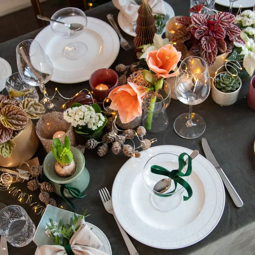 Den mørkegrønne duken gir et dramatisk og stilfullt utgangspunkt. Det hvite serviset og glassene reflekterer lyset fra lyslykter og lyslenker – og gir bordet en lun og eksklusiv glød. Fargepaletten løftes av blomstene i aprikos- og kremtoner, som gir bordet et mykt, moderne og eksklusivt uttrykk.