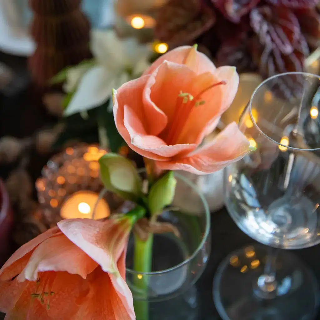Amaryllis i varm aprikos, hvite blomster og svibler i potter skaper et bord med gode kontraster og levende detaljer. Kombinasjonen av store og små planter gir dybde og et elegant spill i uttrykket.