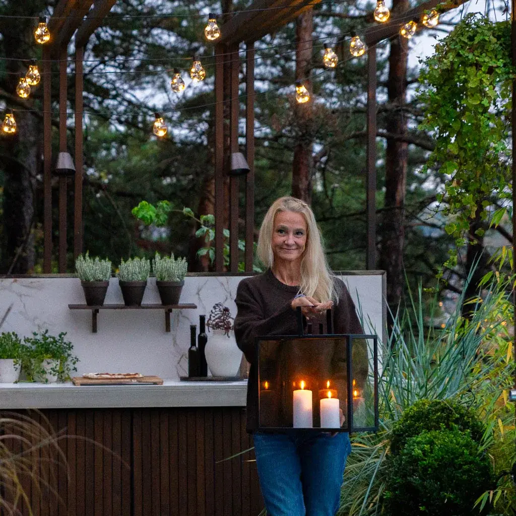 Hanne bruker gjerne LED-kubbelys i lyktene utendørs. De slår seg av og på av seg selv så hun slipper å følge med på dem.