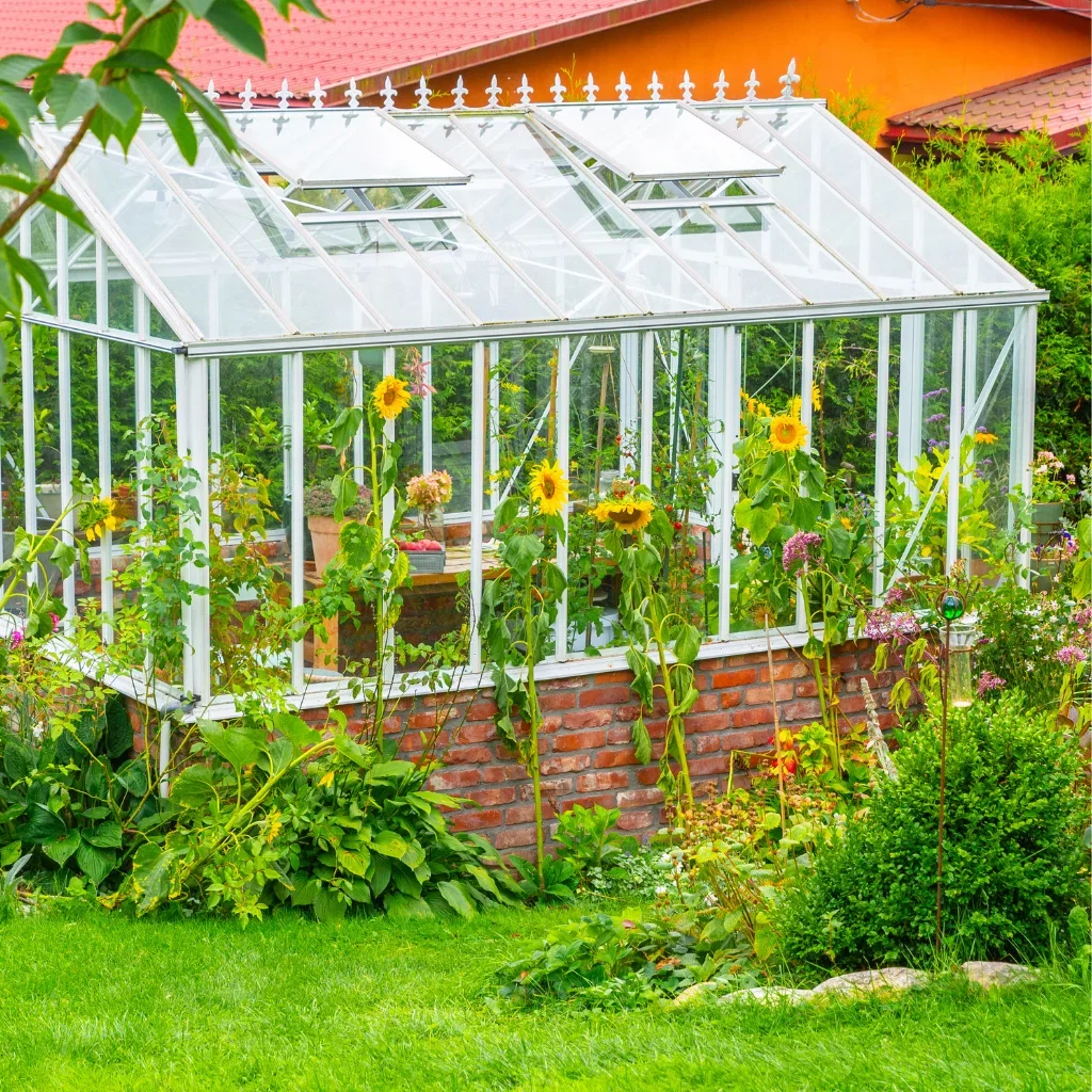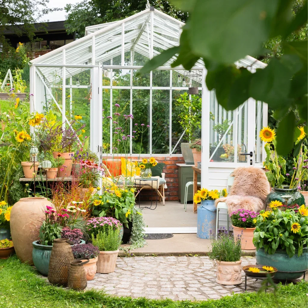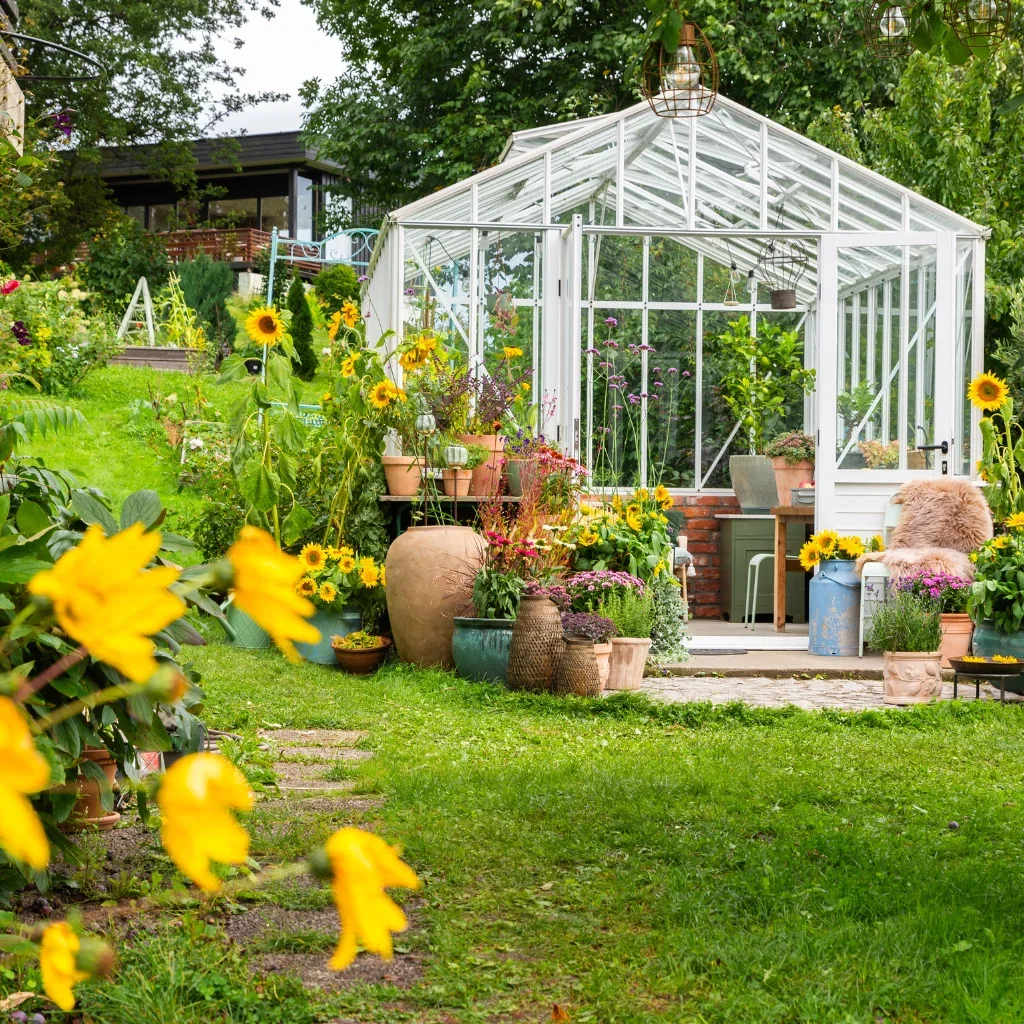 Høye solsikker omkranser det vakre drivhuset. Sammen med steinmuren får de tankene til å vandre mot Sør Europa.