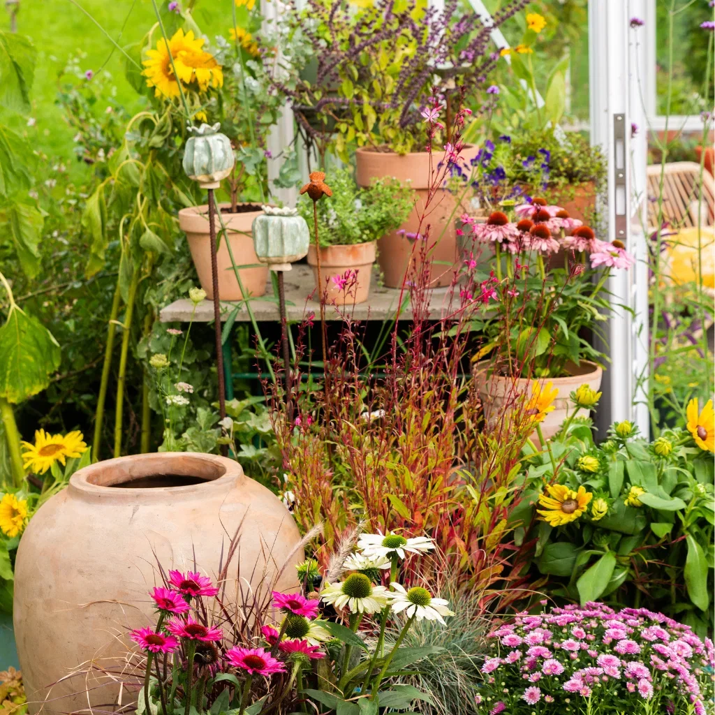 Terrakottapotter i ulike størrelser sammen med solmodne urter, solsikker og stauder i varme farger kjennetegner Middelhavsstilen nå på slutten av hagesesongen.