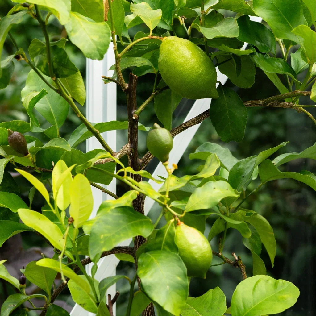 Sitrontreet stortrives ute i drivhuset helt fram til frosten kommer. En ny runde sitroner er på vei. Snart er de gule, saftige og spiseklare.