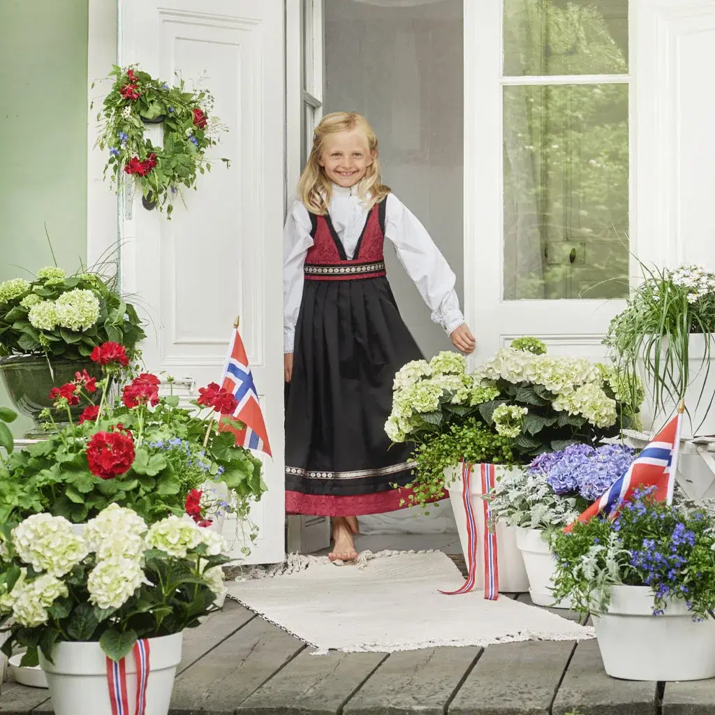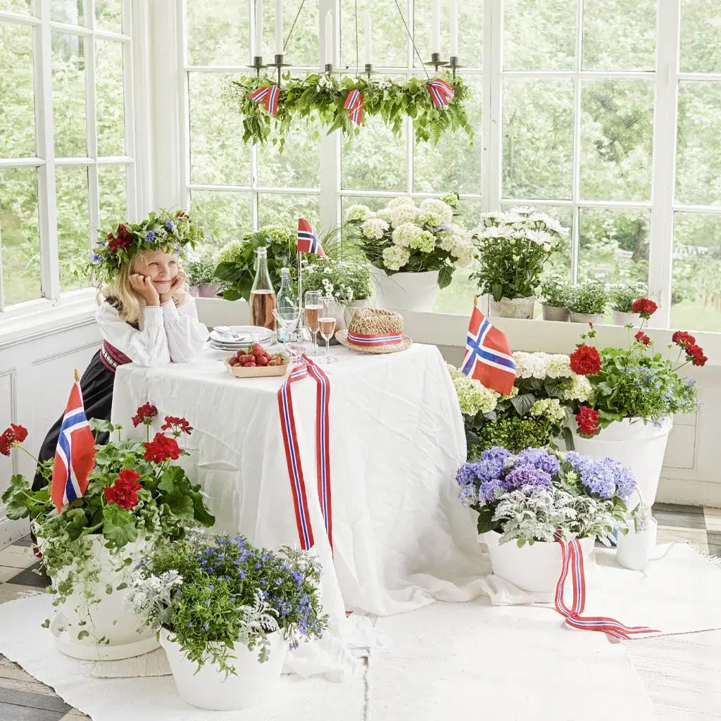 17. mai er en dag for glede, tradisjoner og feiring med venner og familie. Gjør det ekstra hyggelig ute og pynt uteplassen med herlige blomster i rødt, hvitt og blått. Små flagg i potter ved inngangspartiet setter stemningen og ønsker både små og store gjester velkommen. Med litt fargerike blomster, flagg og bordpynt lager du enkelt et vakkert festbord som roper "Hipp hipp hurra!" og får deg og gjestene dine i skikkelig 17.mai-modus.
