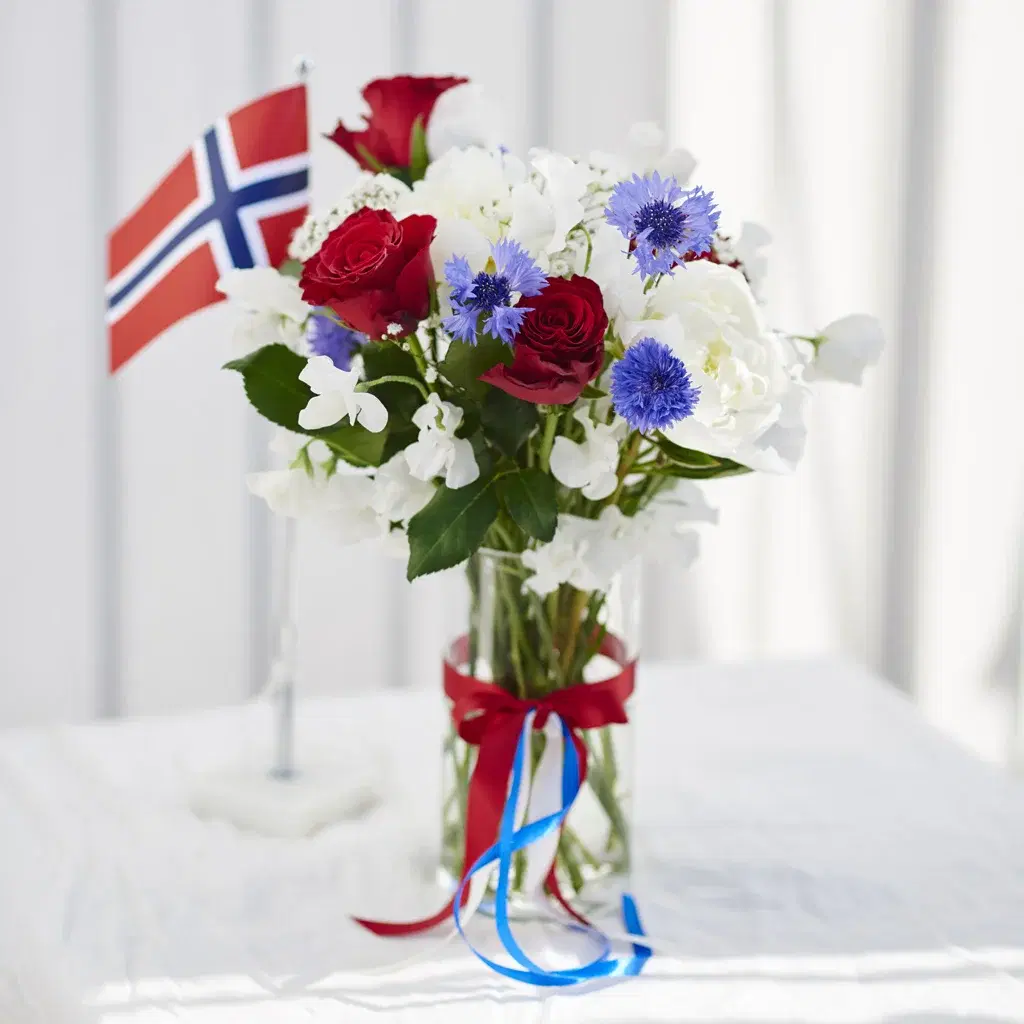 Gjør det fint til 17. mai med fargerike blomster i rødt, hvitt og blått